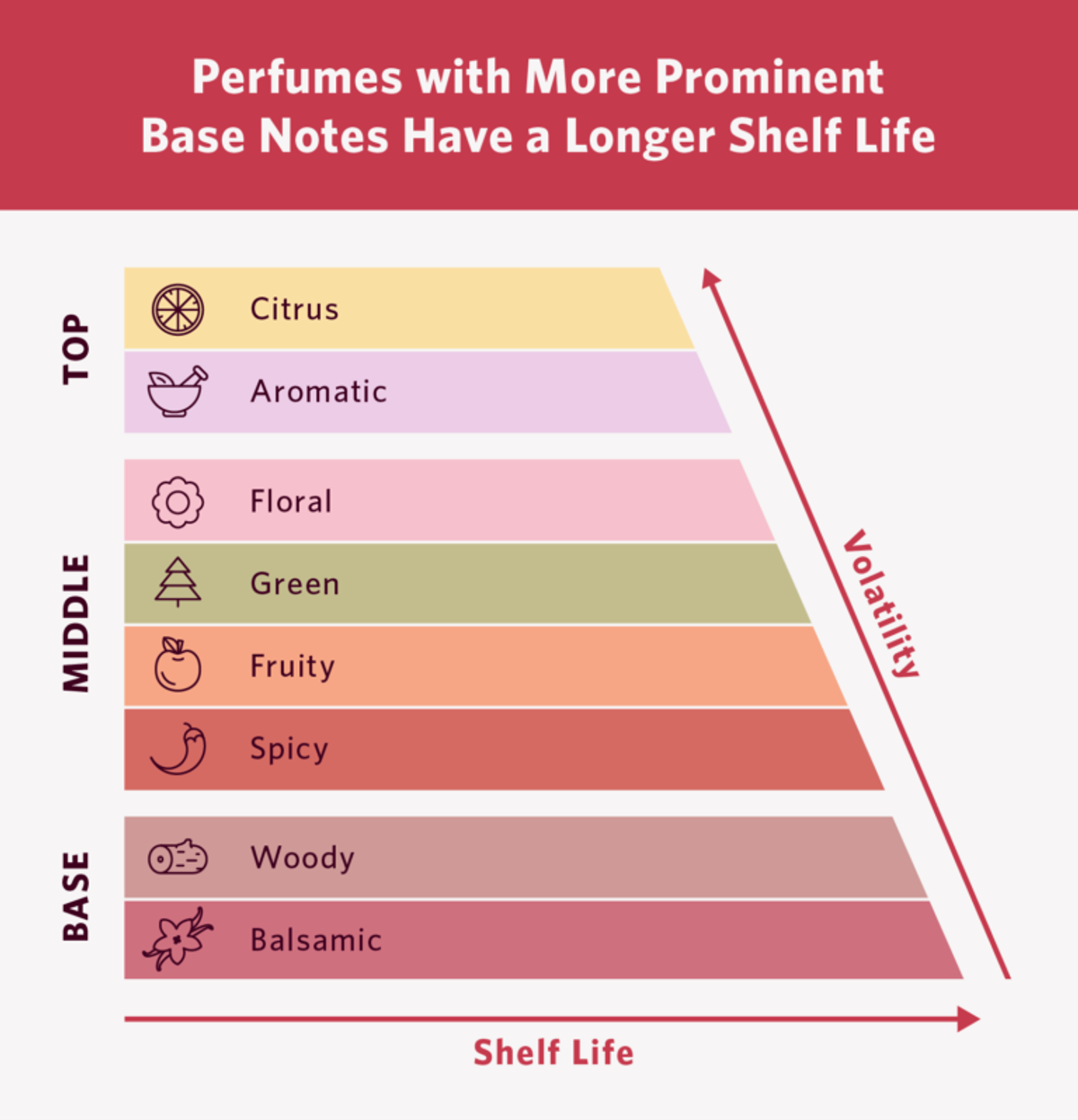 Fragrances with heavier base notes are the ones that last the longest. They can start to smell richer – in a good way – than before as time goes on. Scents which are part of the oriental family tend to be ones with a longer shelf-life due to their lingering woody and spicy notes.